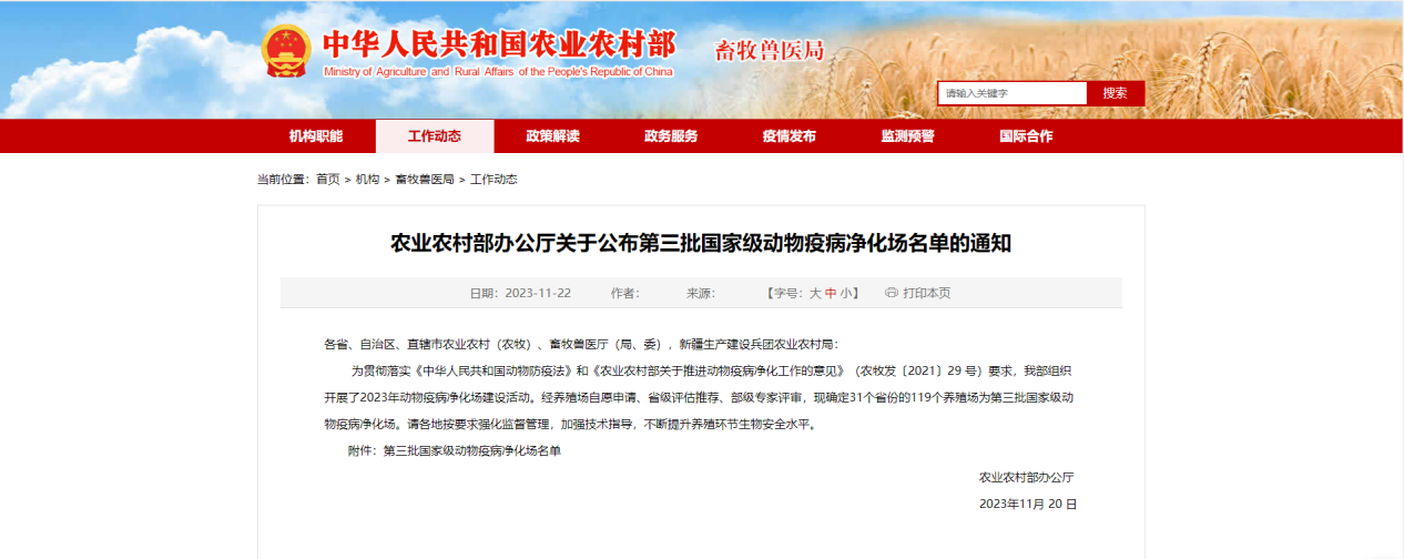 11月20日,農(nóng)業(yè)農(nóng)村部辦公廳發(fā)布第三批國家級動物疫病凈化場名單(農(nóng)辦牧﹝2023﹞29號),我司經(jīng)部級專家評審,被評為國家級羊布魯氏菌?。ǚ敲庖撸﹥艋瘓?。